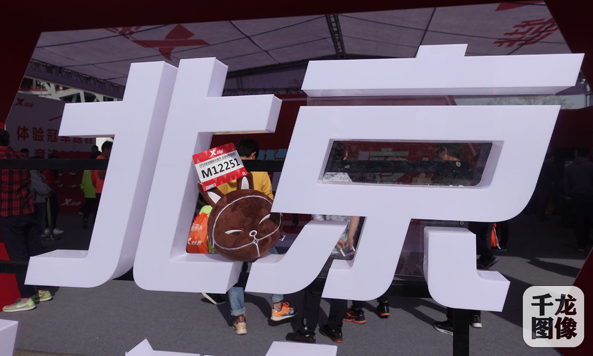 4月12日,北京国际长跑节·北京半程马拉松赛事组委会开始向跑者发放装备。“千龙兔爷”来到北京跑的装备发放点,现场体验参赛装备发放的全部过程。图为“千龙兔爷”在嘉年华互动区。千龙网记者 戚连民摄