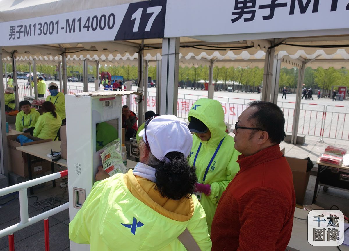 4月12日,北京国际长跑节·北京半程马拉松赛事组委会开始向跑者发放装备。“千龙兔爷”来到北京跑的装备发放点,现场体验参赛装备发放的全部过程。图为参赛者领取号码簿后进行人脸识别信息采集。千龙网记者 戚连民摄