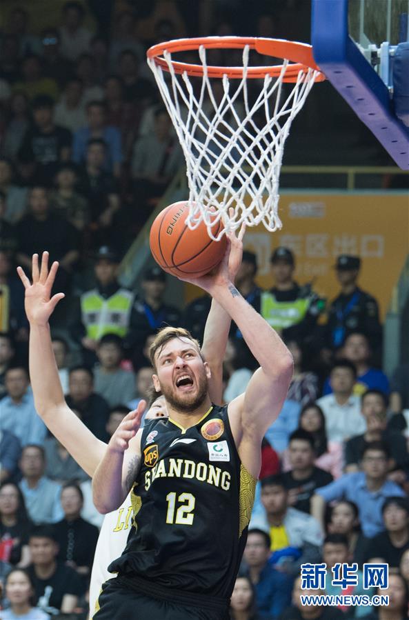 ↑4月11日,山东高速队球员莫泰尤纳斯(前)在比赛中上篮。当日,在2017-2018中国男子篮球职业联赛(CBA)季后赛半决赛第七回合比赛中,浙江广厦控股队主场迎战山东高速队。新华社记者翁忻旸摄