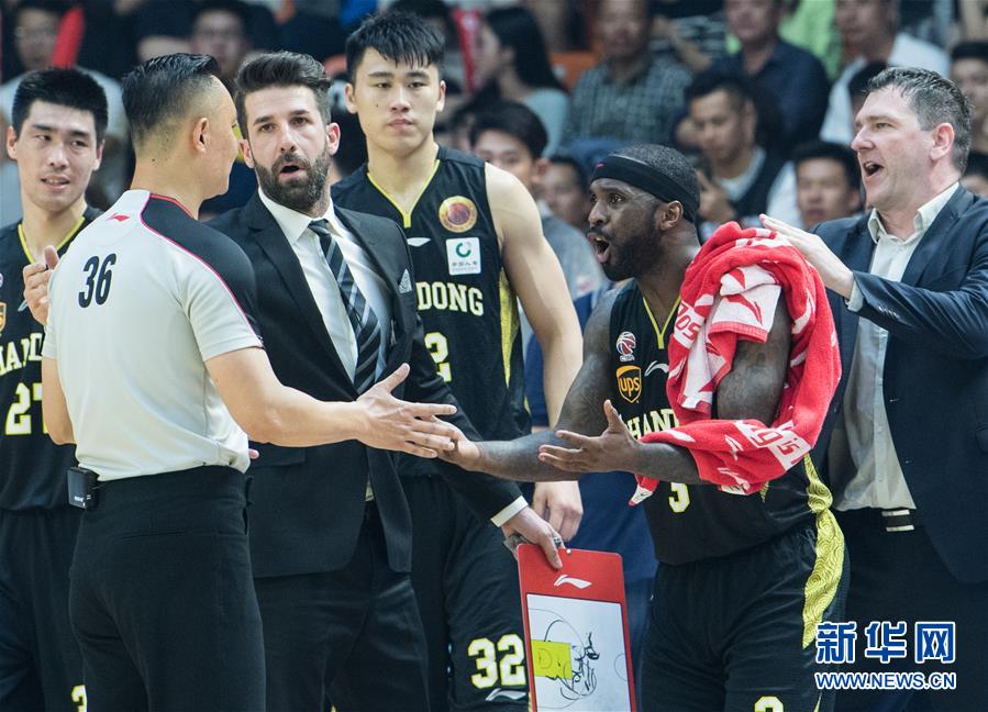 ↑4月11日,山东高速队球员劳森(右二)在被判技术犯规后跟裁判交流。新华社记者翁忻旸摄