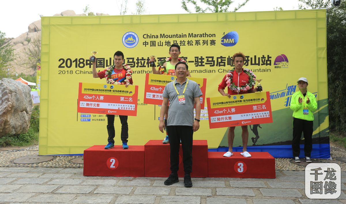 4月15日,2018中国山地马拉松系列赛在河南省驻马店嵖岈山风景区拉开大幕,嵖岈山首站比赛共吸引4000余名跑步爱好者参赛报名。图为男子前三名颁奖仪式。千龙网发 主办方供图。