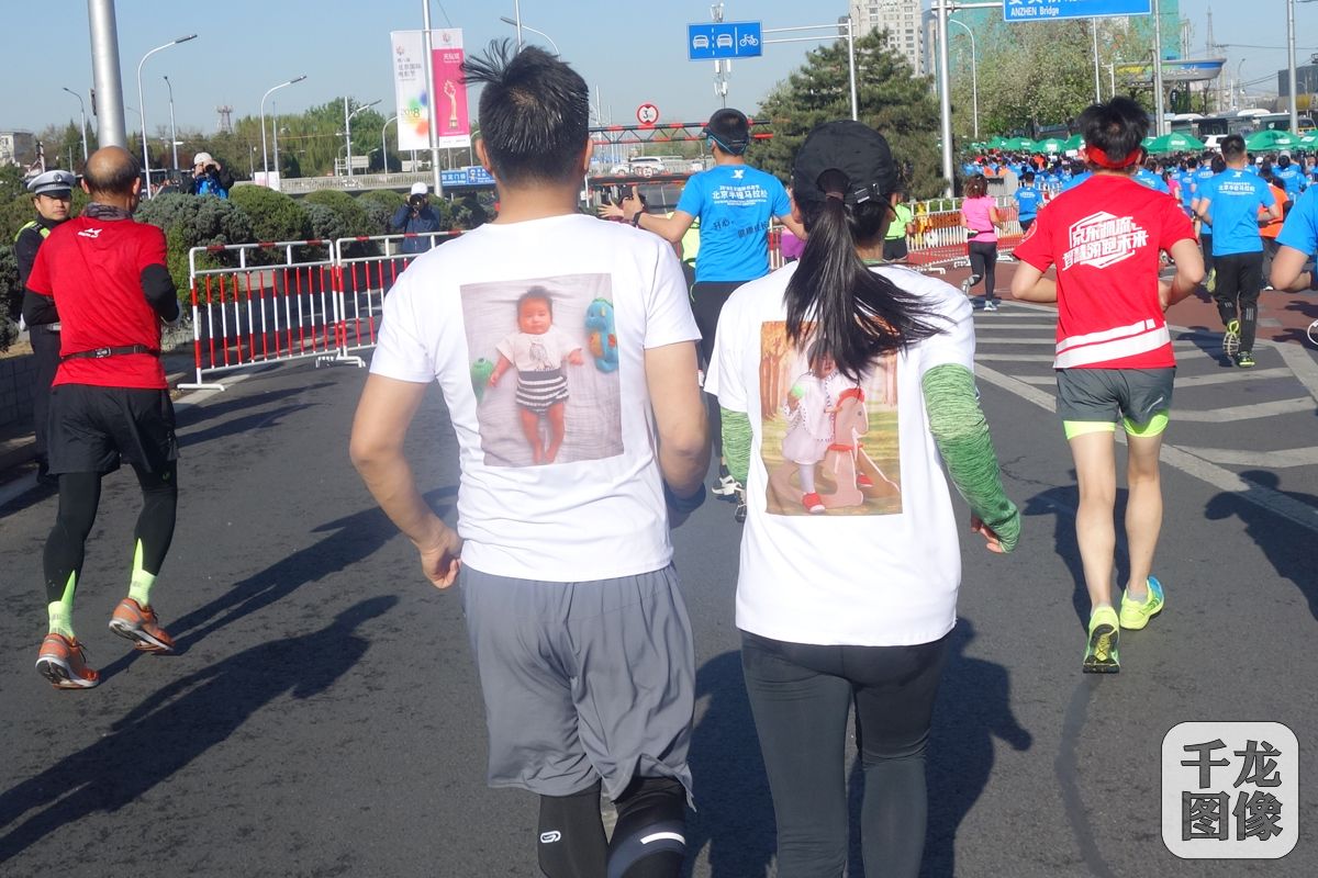 4月15日,2018北京国际长跑节·北京半程马拉松鸣枪。图为一对夫妻在比赛中,他们的参赛服上印着他们的孩子。千龙网记者 黄业摄