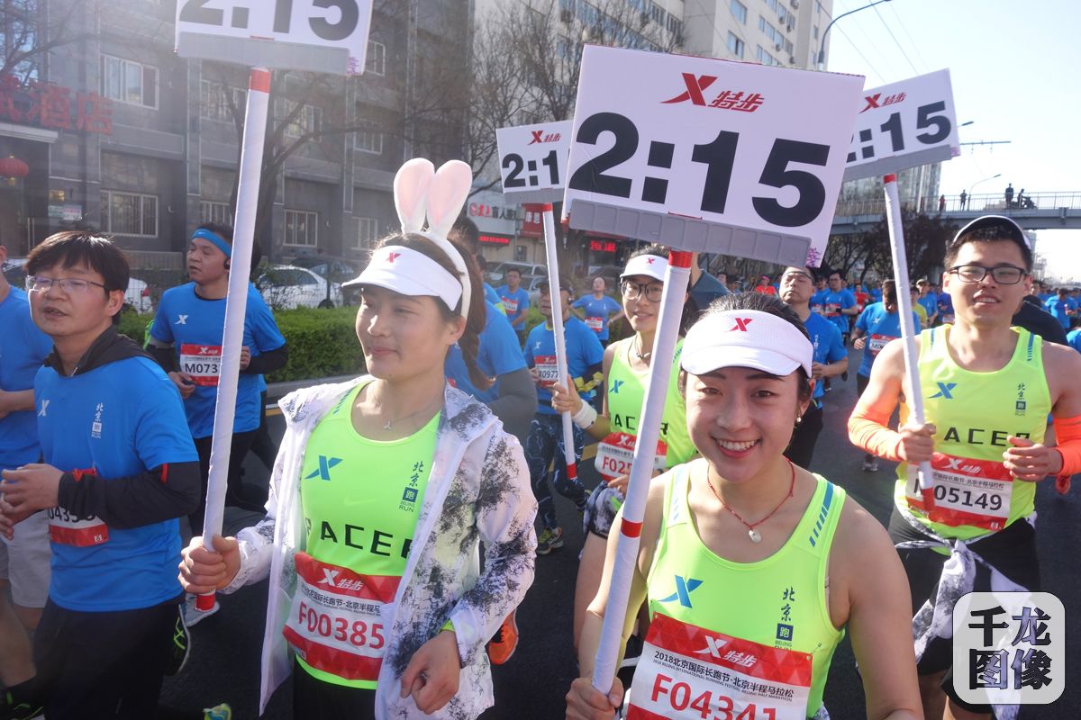 记者在12公里处遇到了四位举着“2:15”牌子的领跑员,他们的任务是帮助想跑进2小时15分钟的跑者更轻松的完赛。只要跑者能跟上他们的节奏并在他们前面冲过终点,就能完成半程马拉松跑进2小时15分钟的目标。有10多名跑者在四位领跑员的带领下,比较轻松的奔跑着。