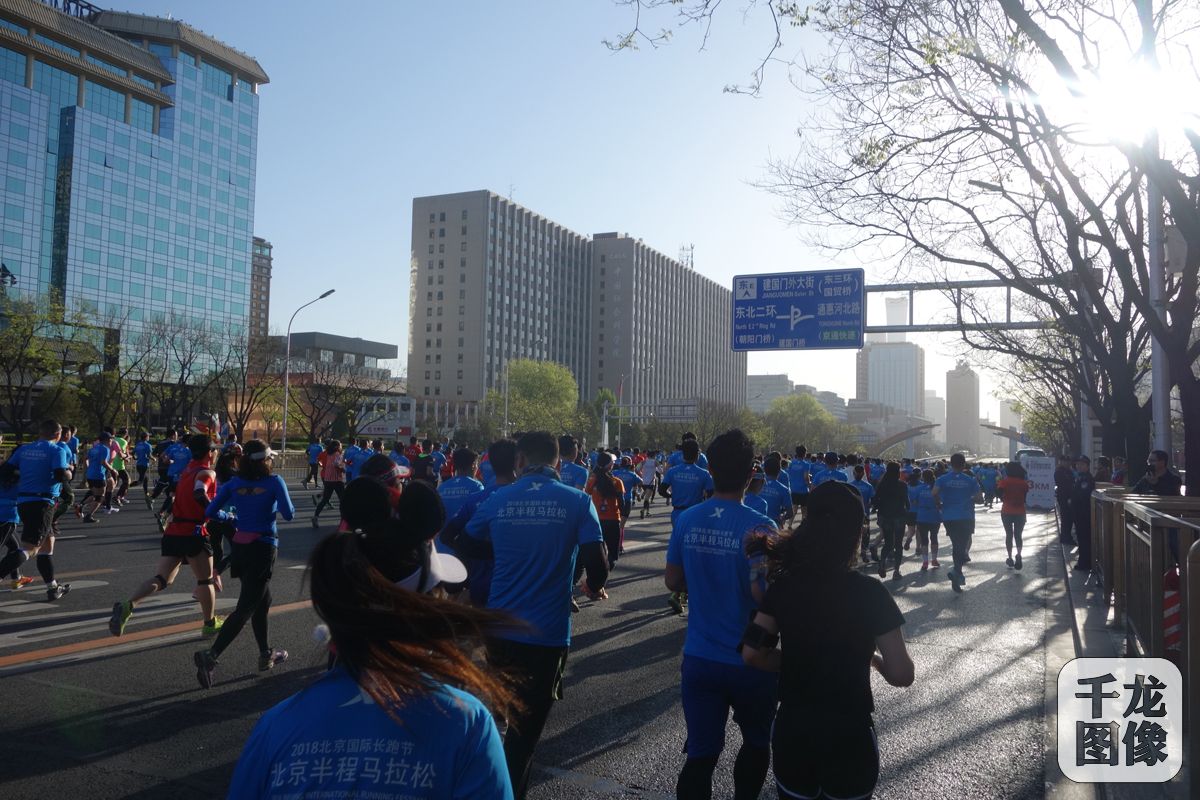 4月15日,2018北京国际长跑节·北京半程马拉松鸣枪。本次比赛设半程马拉松和家庭亲子跑两个项目,分别在天安门广场和奥林匹克公园中心区同时出发。图为跑友们即将跑到建国门。千龙网记者 黄业摄