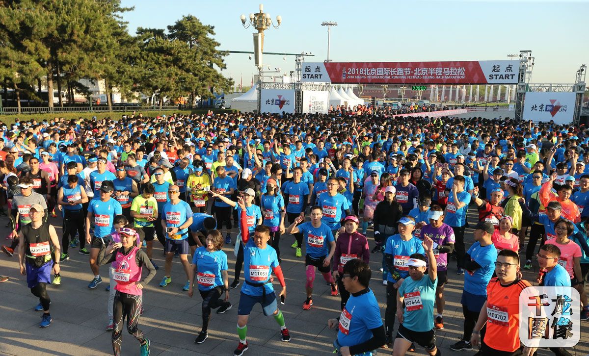 4月15日,2018北京国际长跑节-北京半程马拉松在天安门广场起跑。图为20000余名跑者跑前在健身教练带领下做热身运动。千龙网记者 戚连民摄