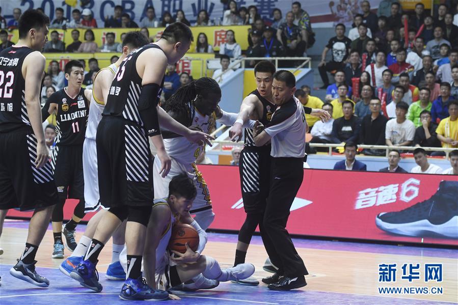 ↑4月15日,浙江广厦控股队球员刘铮(下)与辽宁本钢队球员郭艾伦(右二)发生争执。当日,在2017-2018赛季中国男子篮球职业联赛(CBA)总决赛第一场比赛中,辽宁本钢队客场以120比108战胜浙江广厦控股队。新华社记者黄宗治摄