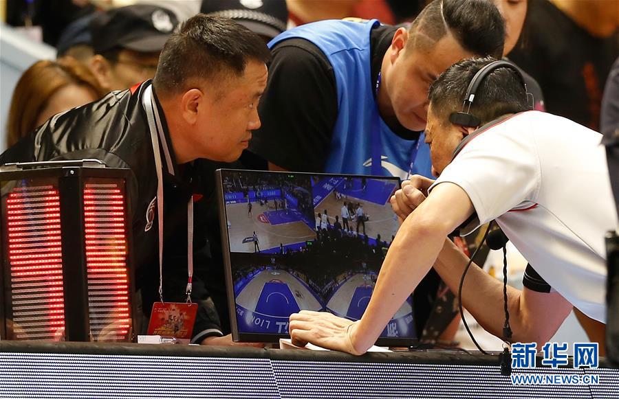 ↑4月17日,裁判在场边观看视频回放。新华社记者王丽莉摄