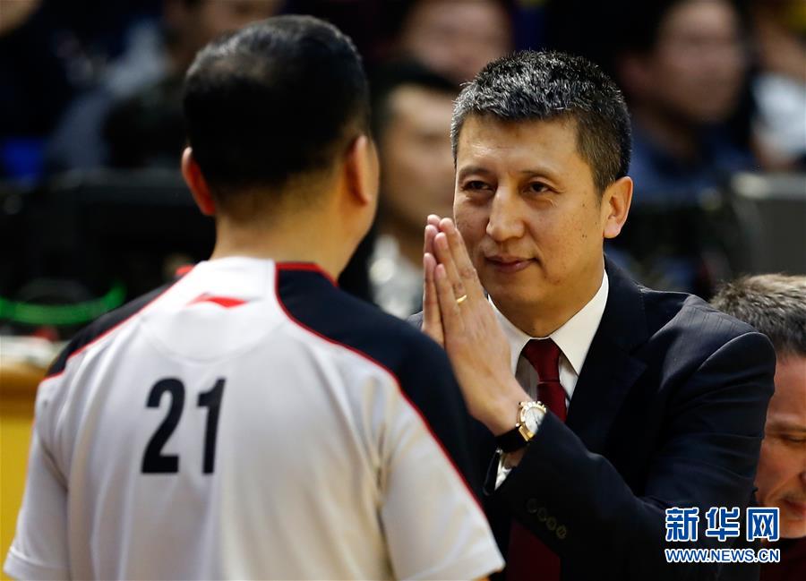 ↑4月17日,辽宁本钢队主教练郭士强(右)在比赛中与裁判交流。新华社记者王丽莉摄