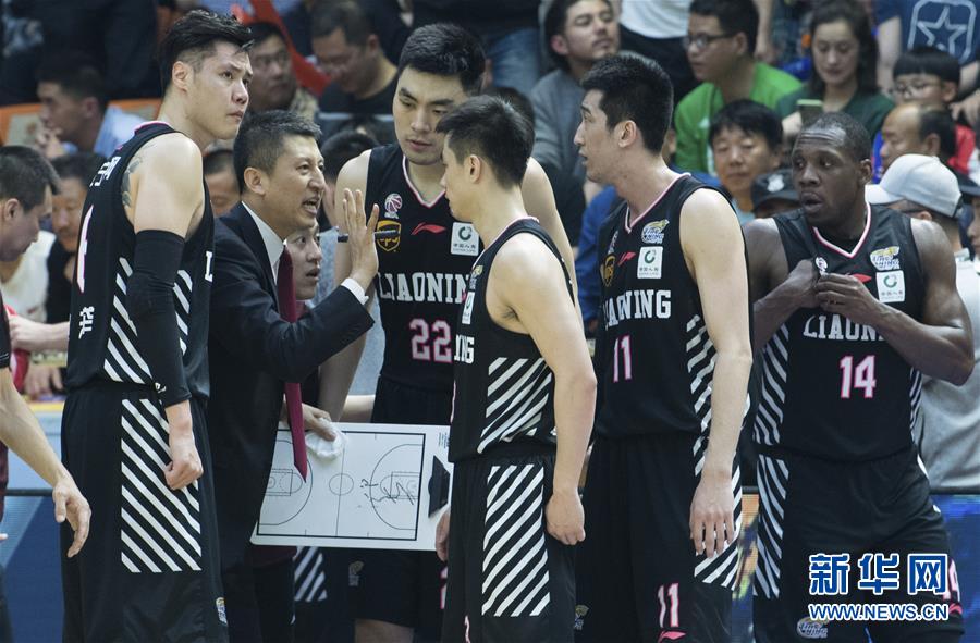 ↑4月17日,辽宁本钢队主教练郭士强(左二)在比赛间隙布置战术。新华社记者翁忻旸摄