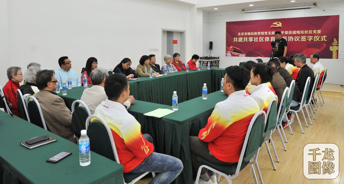 4月18日,北京市地坛体育馆党支部与和平里街道地坛社区党委共同打造《共建共享社区体育服务协议》签字仪式在地坛体育馆举行。地坛社区党委书记沈清、副书记单国华、书记助理赵祺、地坛体育馆党支部书记崔国庆、支委、副馆长苗智、高贵春、支委唐金楠及社区居民代表、体育馆党员及员工代表 30多人,共同见证协议的诞生。图为活动现场。千龙网发 吴晓萌摄
