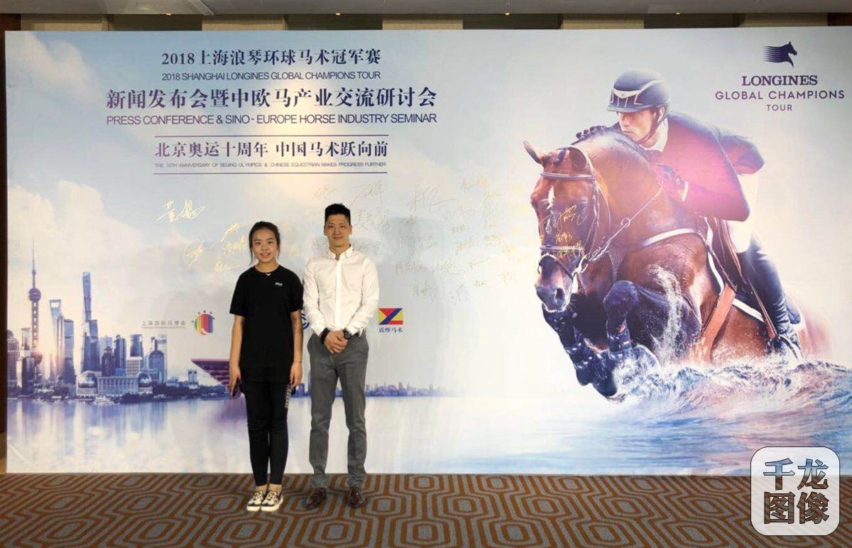 4月19日,“北京奥运十周年,中国马术跃向前”中欧马产业交流研讨会现场,2008北京奥运会骑手赵志文与北京青少年骑手刘亦英合影。千龙网发 夏原浦摄