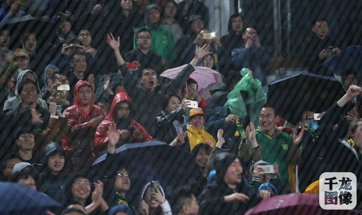 4月22日,中超联赛第七轮上演一场焦点战,北京中赫国安队主场迎战广州恒大,凭借外援奥古斯托和巴坎布终场前的进球,主场2比2逼平卫冕冠军广州恒大队。图为球迷冒雨观赛。千龙网记者 戚连民摄