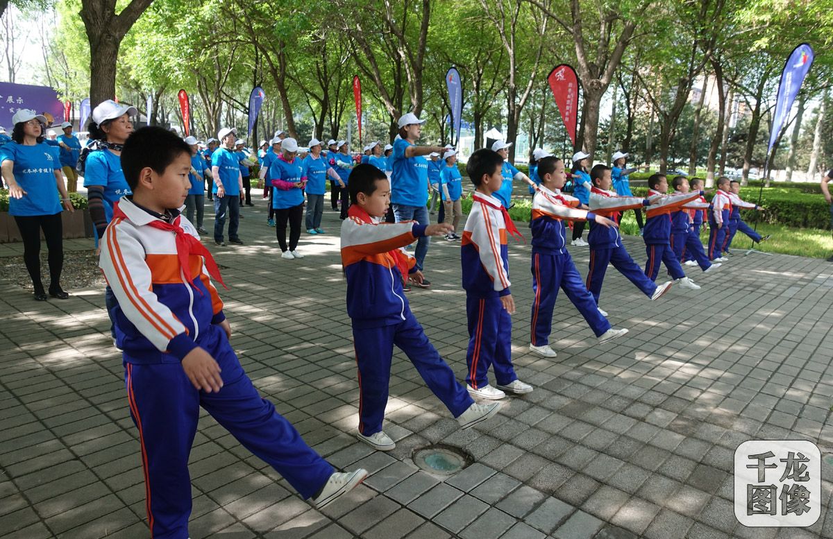 4月25日,北京奥运城市发展促进会(以下简称:奥促会)“悦冬”冰雪健身操推广展示活动在奥林匹克公园举行。图为延庆珍珠泉小学学生参与推广展示活动。千龙网记者 戚连民摄