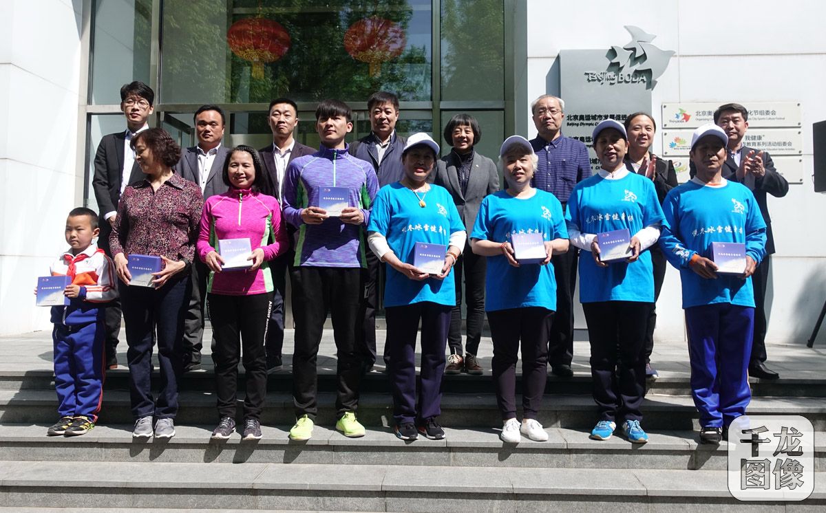 4月25日,北京奥运城市发展促进会(以下简称:奥促会)“悦冬”冰雪健身操推广展示活动在奥林匹克公园举行。图为与会嘉宾向参会市民发放健身操教程。千龙网记者 戚连民摄