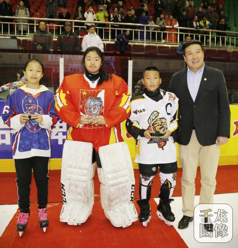 5月1日,第二届“黑龙杯”全国少儿冰球大奖赛在齐齐哈尔市落下帷幕。北京队获得冠军,齐齐哈尔队和哈尔滨 队分获二三名。图为赛后颁奖仪式。千龙网发 组委会供图