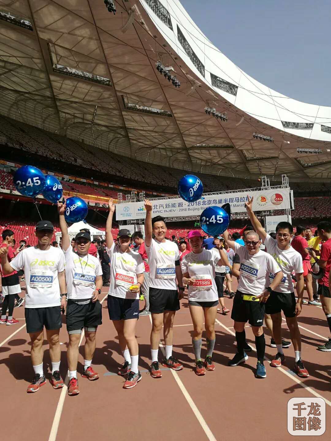 5月6日,2018北京鸟巢半程马拉松鸣枪开跑,来自22个国家及地区近13000名跑者参加。图为首都媒体跑团领队汪涌(右二)和众多领跑员在一起。千龙网发 图片来自汪涌朋友圈