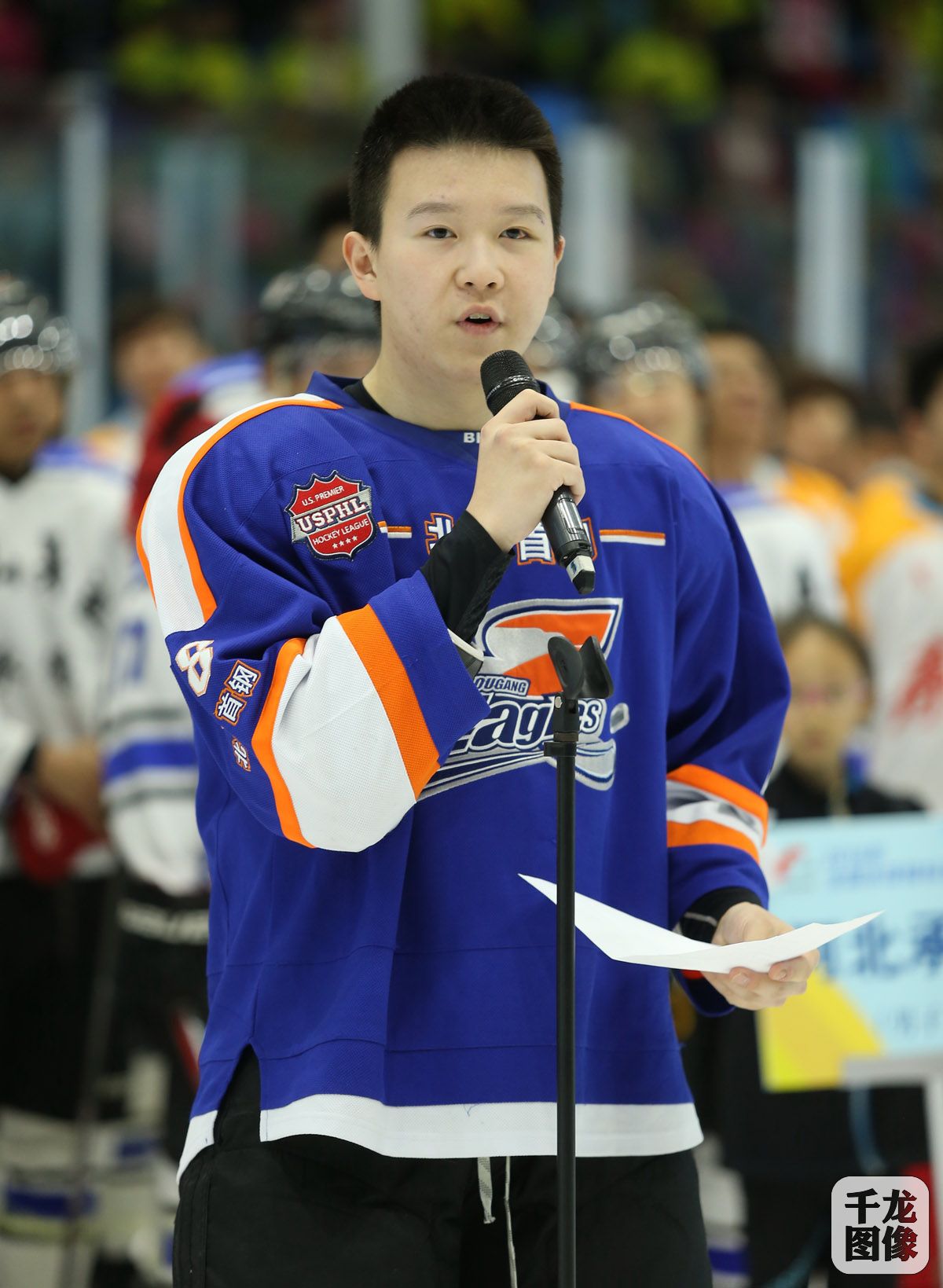 5月7日,2018年全国冰球锦标赛开幕式在奥众冰球运动俱乐部举行。来自全国的28支队伍将参加本次比赛,包括北京首钢冰球队(男队)和北京女子冰球队。这是冬奥会进入“北京周期”后首次在京举行的全国性冰雪赛事,也是全国冰球锦标赛历史上规模最大的一届比赛。图为运动员代表英如镝宣誓。千龙网记者 戚连民摄