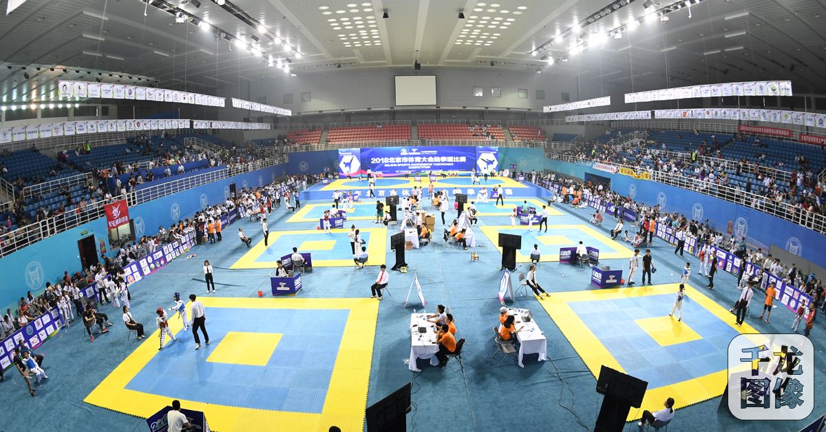 5月12日,2018年第十届北京市体育大会跆拳道比赛开幕式在北京科技大学体育馆举行,来自北京各学校、俱乐部、少年宫等170家单位,4000余跆拳道小朋友齐聚2008年北京奥运会跆拳道比赛场馆。图为比赛现场。千龙网发 崇惠友摄