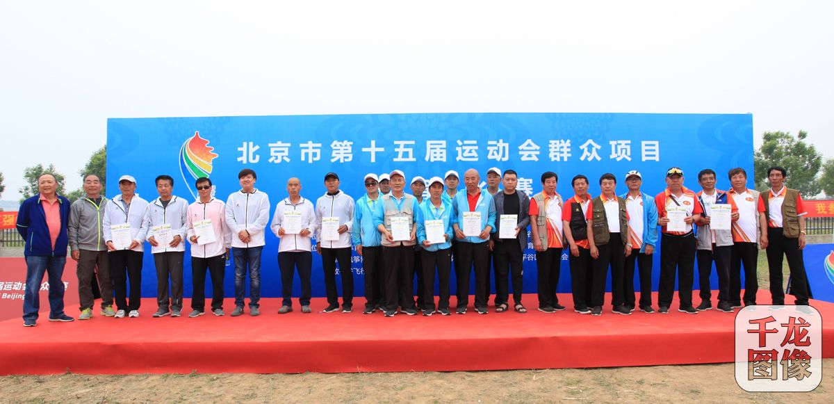 5月12日,北京市第十五届运动会群众项目风筝比赛在汖致平谷飞行营地拉开帷幕。来自14个区和燕山地区的15支代表队,共200余名运动员、教练员和领队参加。图为获奖代表队合影。千龙网发 主办方供图