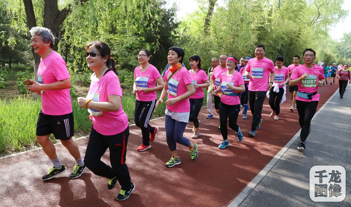 5月13日,建侬体育5K团队跑在奥林匹克森林公园鸣笛起跑,8支跑团参加本次5K团队跑,首都媒体徒步联队荣获本次团队跑第二名。图为首都媒体徒步联队在比赛中。千龙网发 首都媒体徒步联队供图
