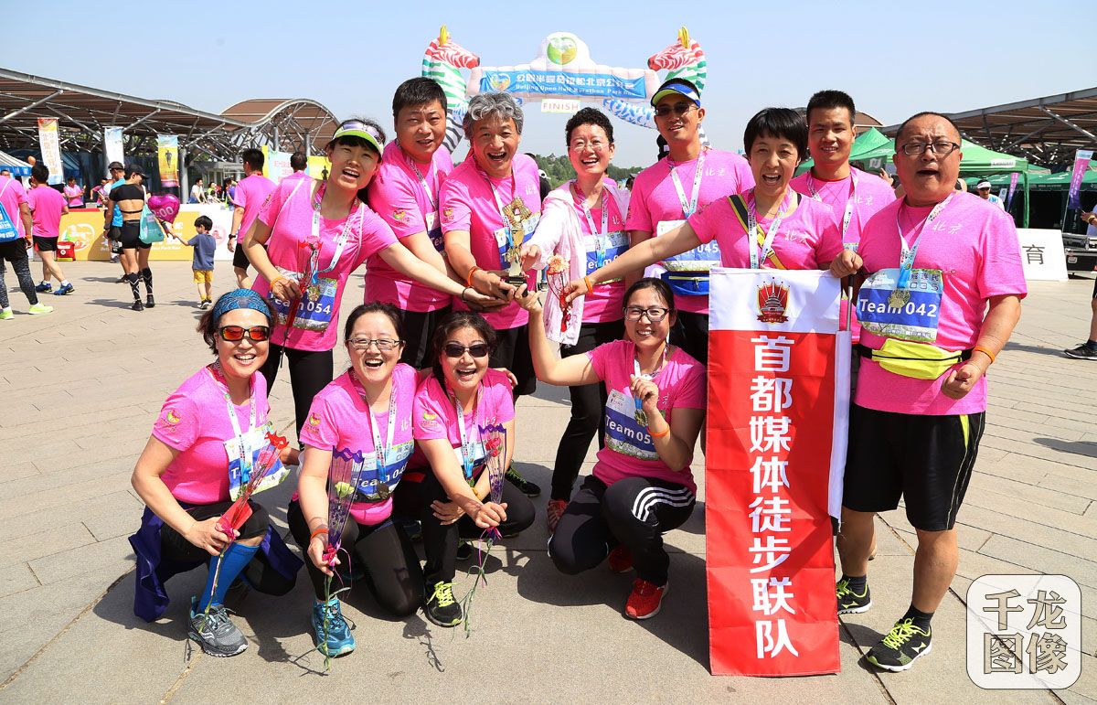 5月13日,建侬体育5K团队跑在奥林匹克森林公园鸣笛起跑,8支跑团参加本次5K团队跑,首都媒体徒步联队荣获本次团队跑第二名。图为首都媒体徒步联队颁奖仪式上领取奖杯。千龙网发 首都媒体徒步联队供图