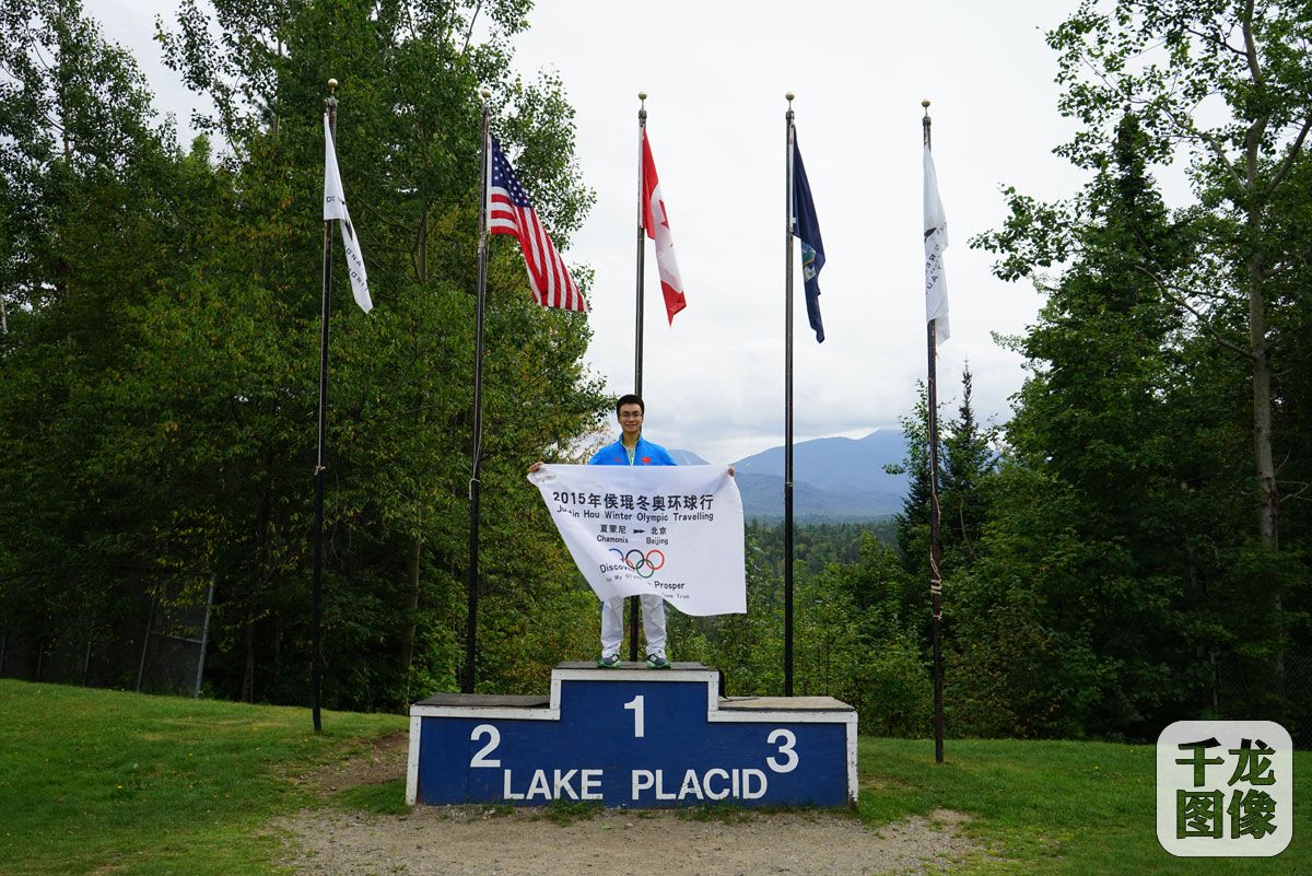 侯琨计划在2018年6月1号前,完成对全部45个奥运城市的访问,向着成为世界奥林匹克环球行第一人迈进。图为他在1932年第三届冬奥会和1980年第13届冬奥会举办城市美国普莱西德湖。千龙网发 侯琨供图