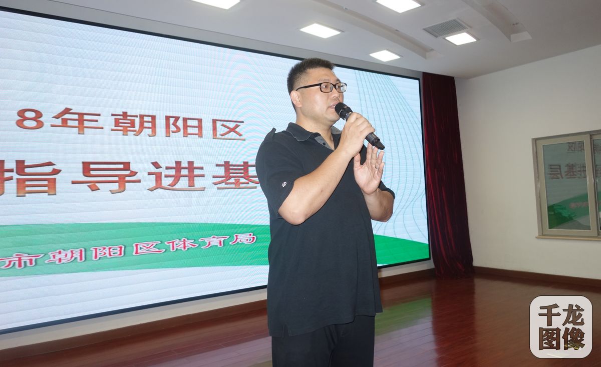 5月18日,朝阳区2018年“健身操专家进基层”活动在朝阳区望京为民服务中心启动,来自朝阳区从事体育工作200余名健身操骨干参加了首站培训。图为朝阳区体育局群体科科长郭鹏致辞。千龙网记者 戚连民摄