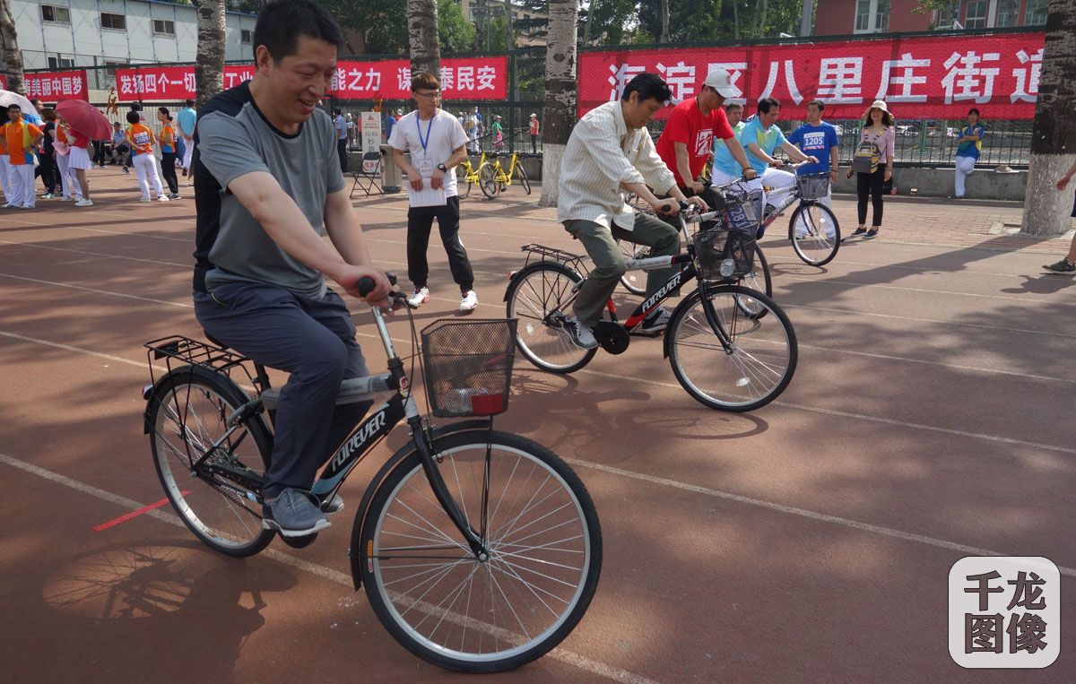 5月19日,以“团结融合 创新发展 共建共享 铸就辉煌”为主题的海淀区八里庄街道“玲珑杯”首届地区运动会在首都师范大学体育场举行。图为自行车慢骑100米比赛。千龙网记者 戚连民摄