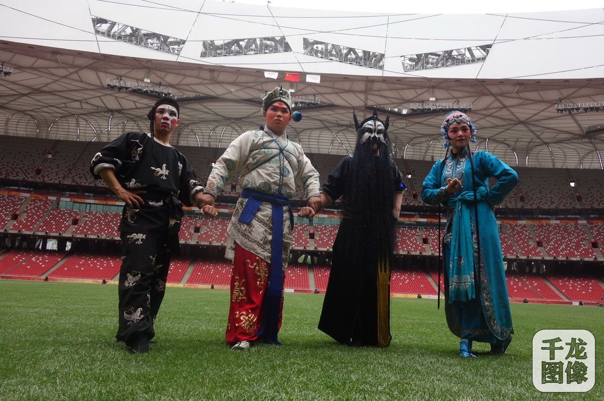 5月19日,中国旅游日当天,国家体育场鸟巢正式推出全新旅游线路,游客不仅可以在白天饱览场馆的建筑特色,漫步鸟巢屋顶钢结构,了解奥运文化,参与体育项目互动,还可以品味与动漫结合的国粹新京剧,更能在晚间欣赏到动感震撼的灯光交响视听秀。图为京剧演员在鸟巢摆出剧中造型。千龙网记者 戚连民摄
