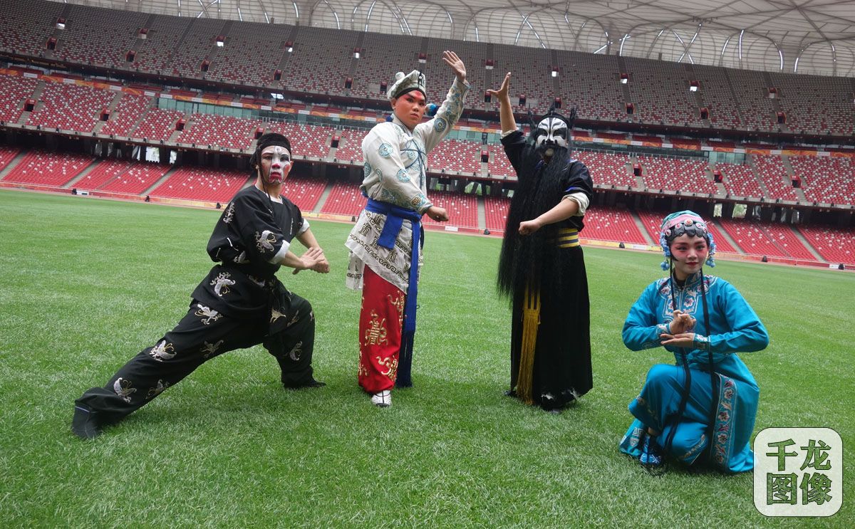 5月19日,中国旅游日当天,国家体育场鸟巢正式推出全新旅游线路,游客不仅可以在白天饱览场馆的建筑特色,漫步鸟巢屋顶钢结构,了解奥运文化,参与体育项目互动,还可以品味与动漫结合的国粹新京剧,更能在晚间欣赏到动感震撼的灯光交响视听秀。图为京剧演员在鸟巢摆出剧中造型。千龙网记者 戚连民摄