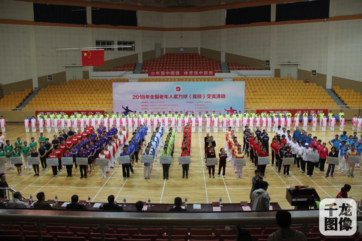 5月22日,2018年全国老年人柔力球(竞技)交流活动在北京市地坛体育馆举行。图为参加比赛的运动员在开幕式上。千龙网记者 黄业摄