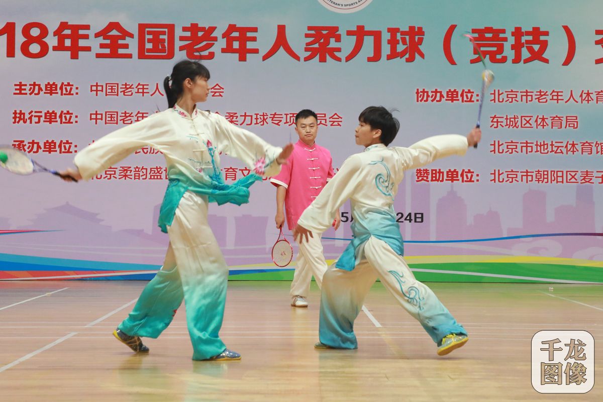 5月22日,2018年全国老年人柔力球(竞技)交流活动在北京市地坛体育馆举行。图为开幕式上的太极柔力球表演。千龙网发 主办方供图