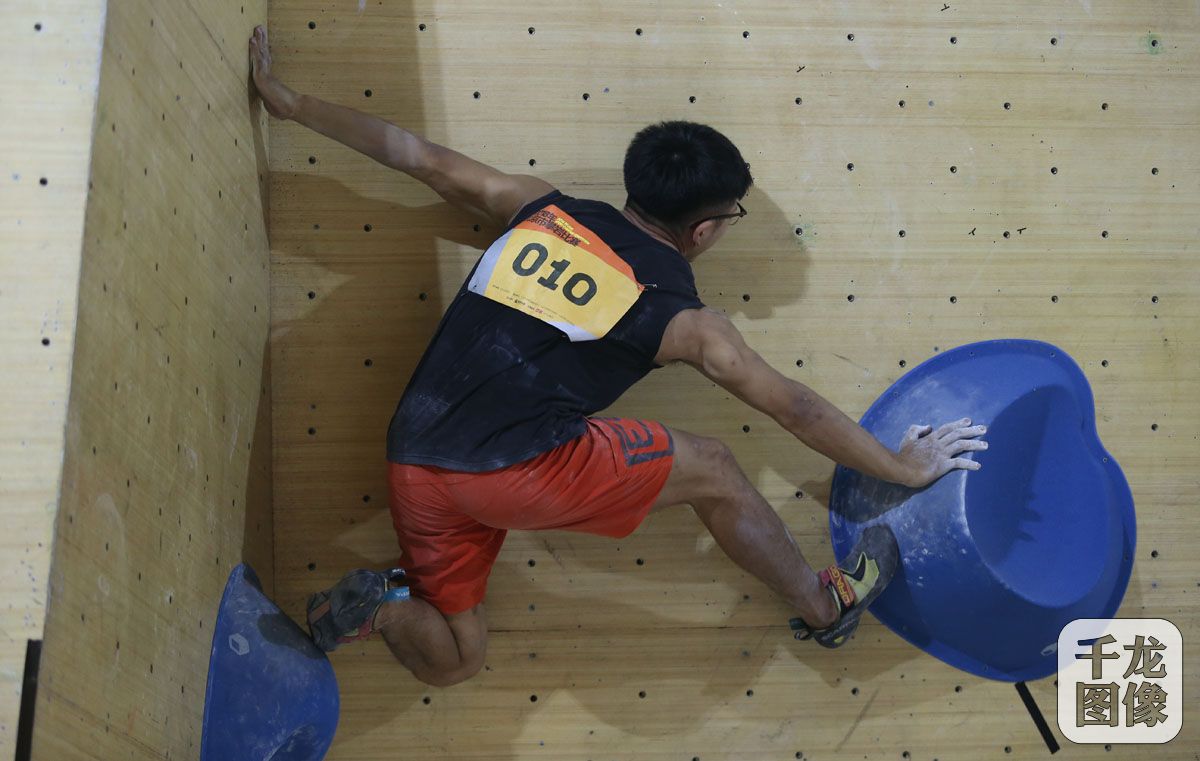 5月26日,2018年北京市攀岩比赛5月26日在朝阳区岩时攀岩馆开赛,赛事分为预赛和决赛两个阶段进行,设有男子组和女子组两个竞赛组别,并设有难度赛、速度赛、攀石赛共3个竞赛项目。图为参赛选手在比赛中。千龙网记者 戚连民摄