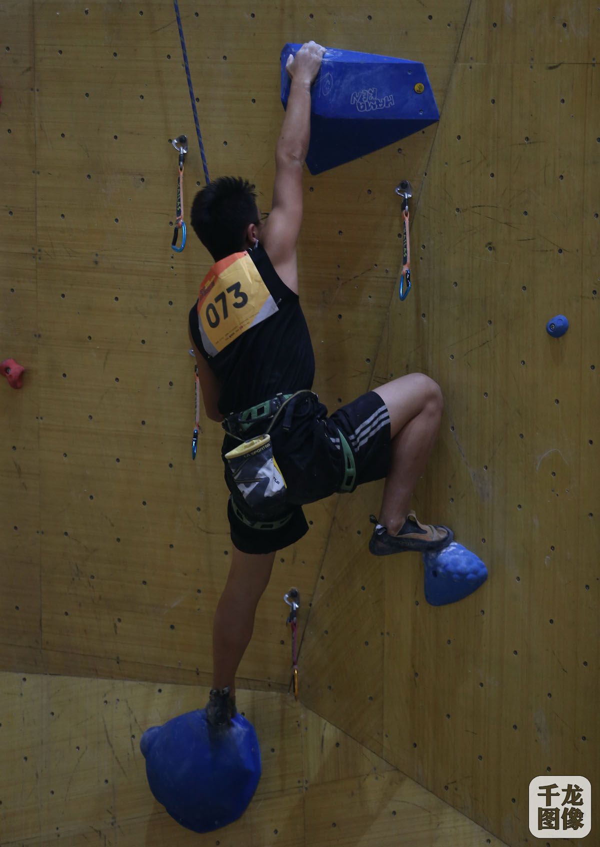 5月26日,2018年北京市攀岩比赛5月26日在朝阳区岩时攀岩馆开赛,赛事分为预赛和决赛两个阶段进行,设有男子组和女子组两个竞赛组别,并设有难度赛、速度赛、攀石赛共3个竞赛项目。图为参赛选手在比赛中。千龙网记者 戚连民摄