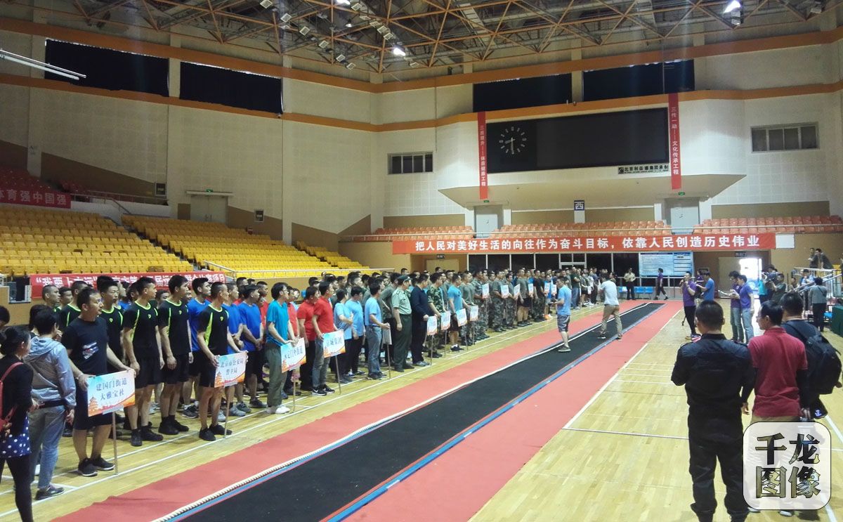 5月29日,2018年北京市第七届拔河比赛(东城赛区)暨东城区“双拥杯”军民拔河比赛在地坛体育馆举办,来自驻区武警部队14支代表队,机关单位9支代表队,共计262名运动员参赛。图为比赛现场。千龙网发 东城区体育局供图