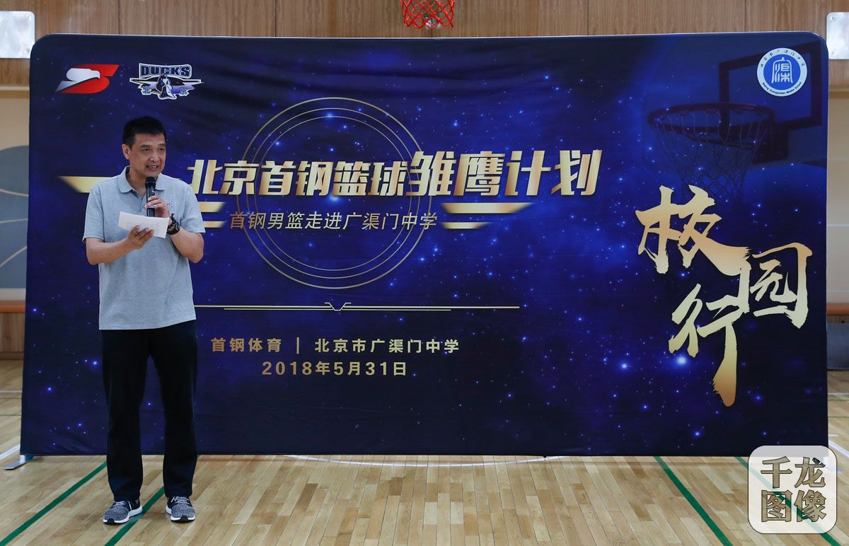 5月31日,北京首钢篮球“雏鹰计划”校园行活动的第一站在广渠门中学举行,首钢体育雏鹰计划总负责人、首钢篮球总教练闵鹿蕾和首钢男篮队员朱彦西、张才仁、王旭、塔瑞克·加尼尤来到学校,与学生们进行篮球游戏。图为首钢体育雏鹰计划总负责人、首钢篮球总教练闵鹿蕾致辞。千龙网发 北京首钢篮球俱乐部供图