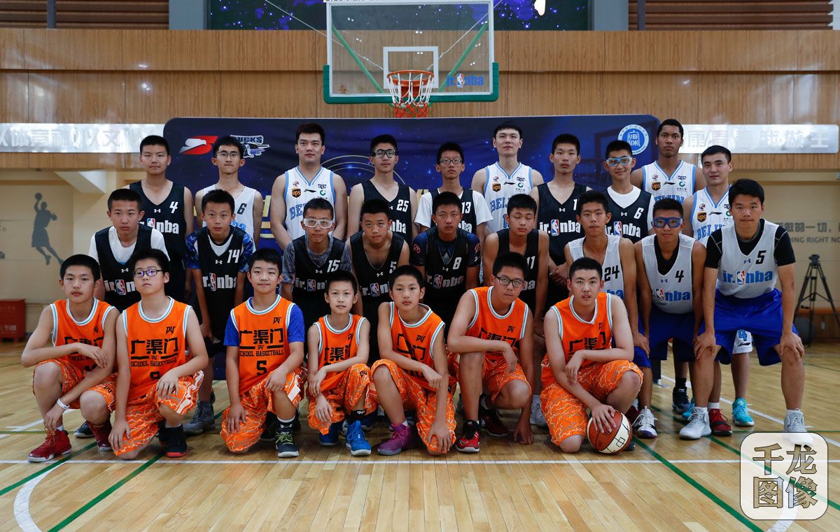 5月31日,北京首钢篮球“雏鹰计划”校园行活动的第一站在广渠门中学举行,首钢体育雏鹰计划总负责人、首钢篮球总教练闵鹿蕾和首钢男篮队员朱彦西、张才仁、王旭、塔瑞克·加尼尤来到学校,与学生们进行篮球游戏。图为首钢男篮队员朱彦西、张才仁、王旭、塔瑞克·加尼尤与学生合影。千龙网发 北京首钢篮球俱乐部供图