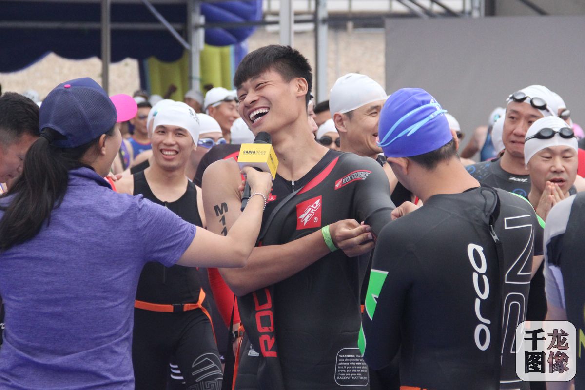 第19届三夫国际铁人三项赛6月3日在北京平谷金海湖落下帷幕。图为精英选手在赛前接受现场主持人采访。千龙网记者 黄业摄