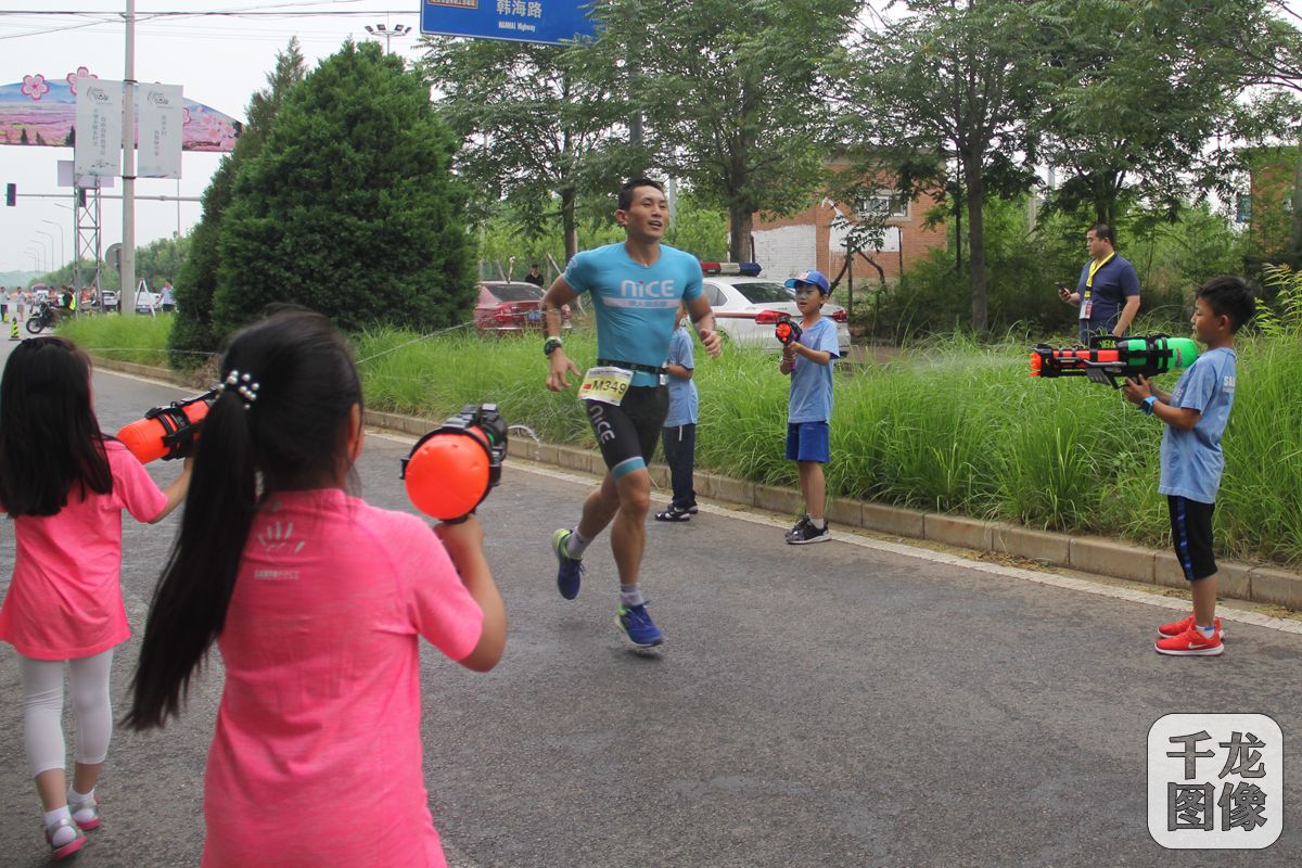 第19届三夫国际铁人三项赛6月3日在北京平谷金海湖落下帷幕。图为小朋友们用水枪为选手降温。千龙网记者 黄业摄