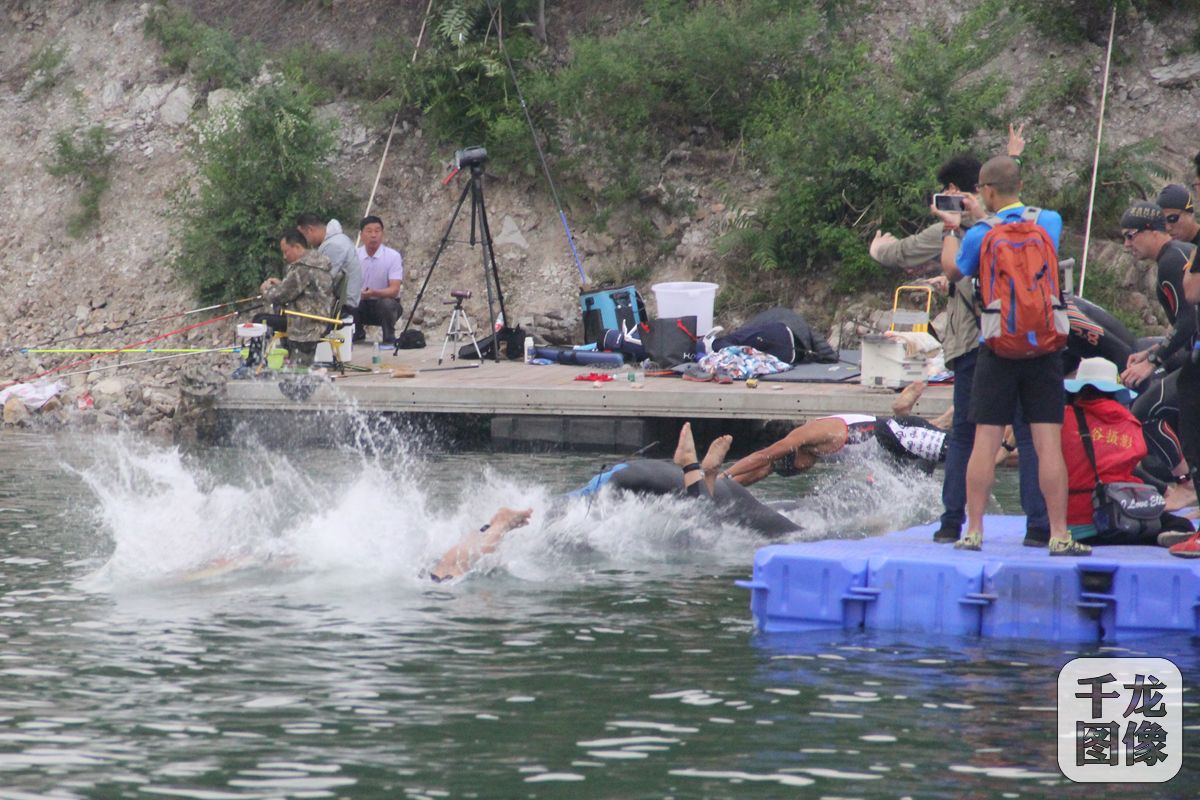 第19届三夫国际铁人三项赛6月3日在北京平谷金海湖落下帷幕。图为精英选手入水瞬间。千龙网记者 黄业摄