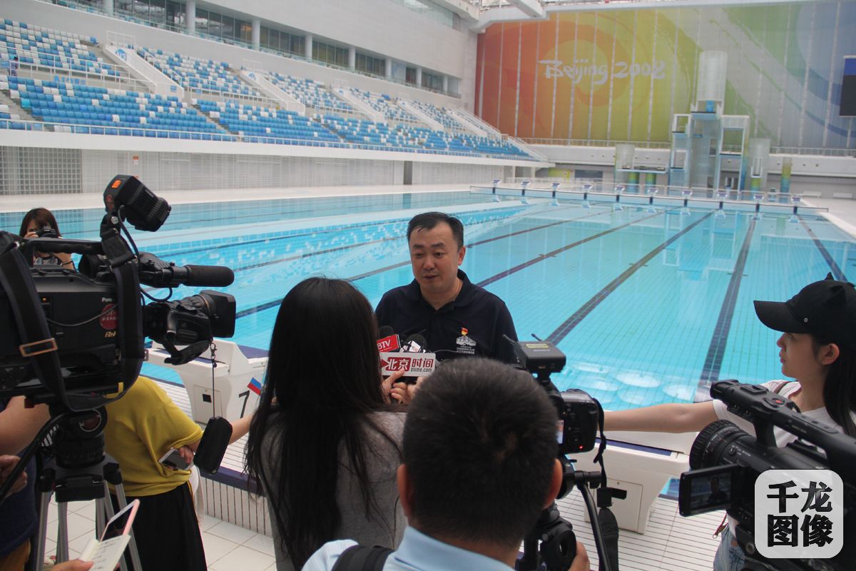 6月12日上午,北京国家游泳中心有限责任公司总经理杨奇勇在水立方接受记者采访。千龙网记者 黄业摄