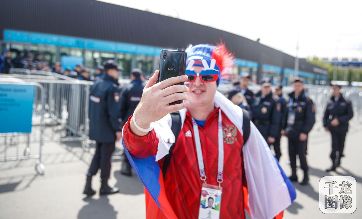 6月14日,2018FIFA世界杯揭幕战在俄罗斯莫斯科激情打响,东道主俄罗斯队以5:0大胜沙特队,俄罗斯球员切里舍夫当选全场非凡之星。图为球迷自拍。千龙网发 vivo品牌供图