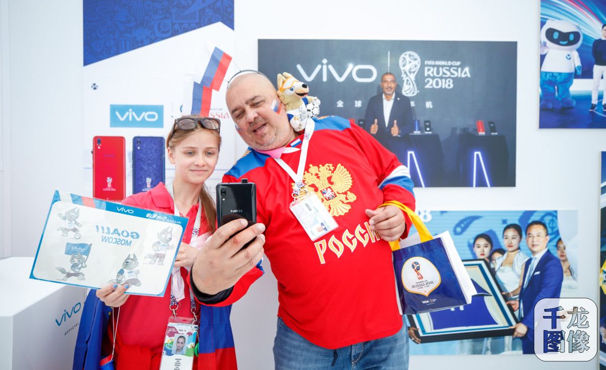 6月14日,2018FIFA世界杯揭幕战在俄罗斯莫斯科激情打响,东道主俄罗斯队以5:0大胜沙特队,俄罗斯球员切里舍夫当选全场非凡之星。图为球迷自拍。千龙网发 vivo品牌供图