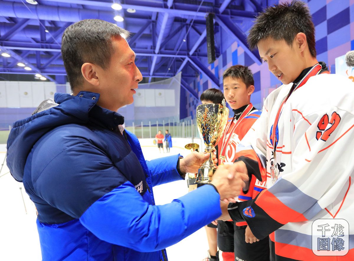 6月18日,第六届北京市中小学生校际冰球联赛在北京凯文学校冰场迎来了本届联赛的最后一场比赛,本届联赛是北京中小学生校际冰球联赛开展以来参赛学校数、参赛队伍队数、参赛运动员数最多的一届。图为北京市体育局青少处本处长苏峻为获奖队伍颁奖。千龙网发 主办方供图