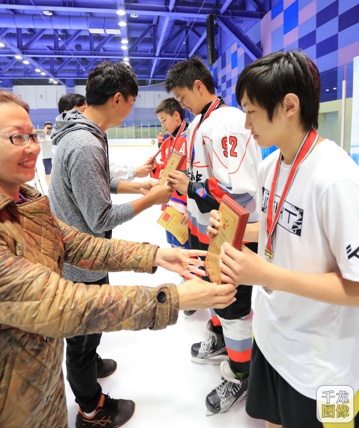6月18日,第六届北京市中小学生校际冰球联赛在北京凯文学校冰场迎来了本届联赛的最后一场比赛,本届联赛是北京中小学生校际冰球联赛开展以来参赛学校数、参赛队伍队数、参赛运动员数最多的一届。图为本届比赛颁奖仪式。千龙网发 主办方供图