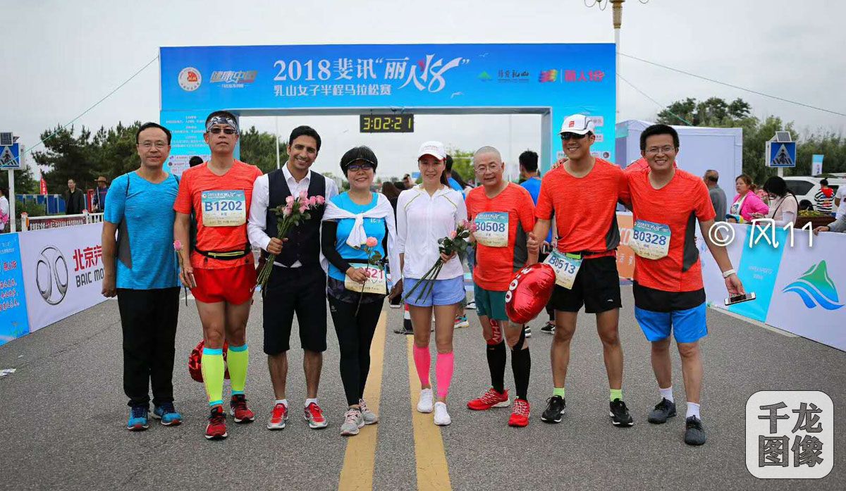 6月17日,2018斐讯“丽人18”乳山女子半程马拉松赛在山东乳山银滩旅游度假区大拇指广场激越鼓锣声中浪漫起跑。图为2000年悉尼奥运会女子20公里竞走冠军王丽萍(右四)新华社高级记者、首都媒体跑团创始人兼领队汪涌(右三)在活动现场合影。千龙网发 图片来自汪涌朋友圈和王者传奇公众号
