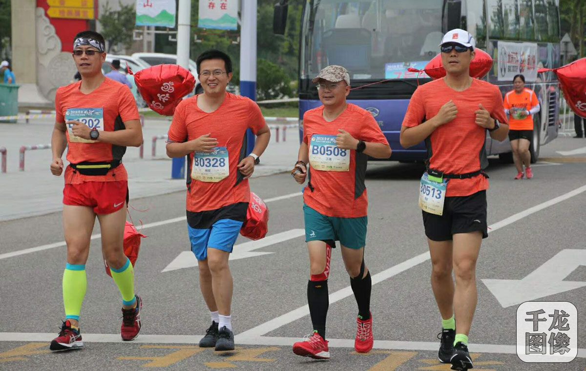 6月17日,2018斐讯“丽人18”乳山女子半程马拉松赛在山东乳山银滩旅游度假区大拇指广场激越鼓锣声中浪漫起跑。图为新华社高级记者、首都媒体跑团创始人兼领队汪涌(右二)奔跑在赛道上。千龙网发 图片来自汪涌朋友圈和王者传奇公众号