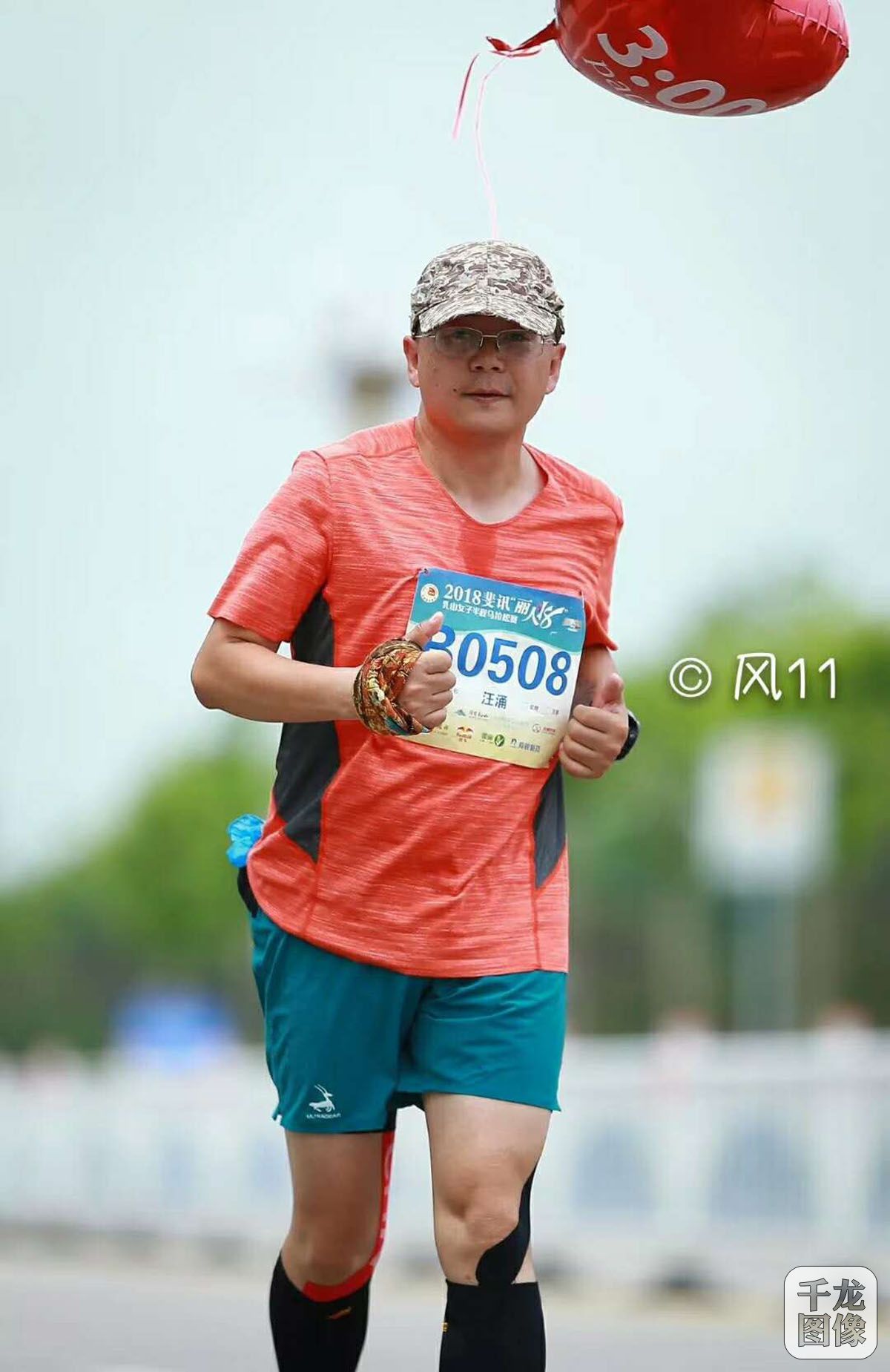6月17日,2018斐讯“丽人18”乳山女子半程马拉松赛在山东乳山银滩旅游度假区大拇指广场激越鼓锣声中浪漫起跑。图为新华社高级记者、首都媒体跑团创始人兼领队汪涌作为赛事官方配速员奔跑在优美的赛道上。千龙网发 图片来自汪涌朋友圈和王者传奇公众号