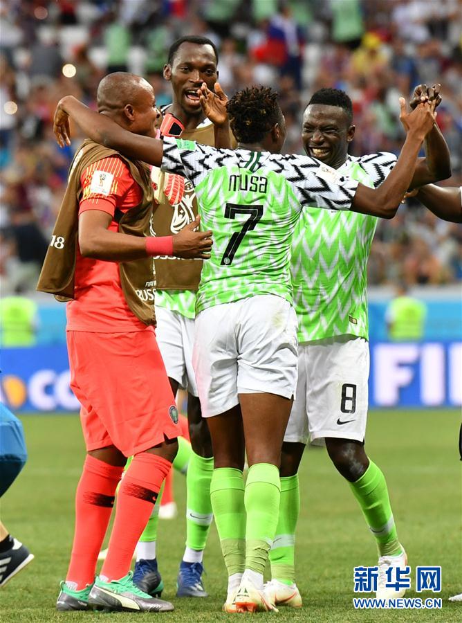 6月22日,尼日利亚队球员在比赛后庆祝胜利。当日,在伏尔加格勒进行的2018俄罗斯世界杯足球赛D组小组赛中,尼日利亚队以2比0战胜冰岛队。 新华社记者吕小炜摄
