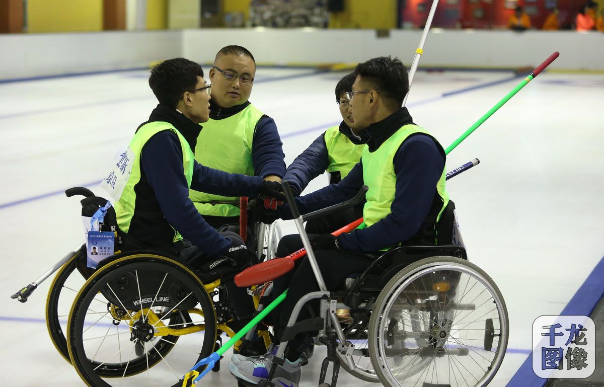 7月3日,2018年全国残疾人冰壶锦标赛在京开幕。比赛分为轮椅组和听障组两个组别,将进行循环和交叉淘汰两个阶段的比赛,最终确定冠军归属。图为北京队队员比赛中相互鼓励。千龙网记者 戚连民摄